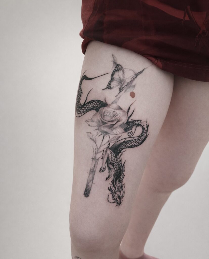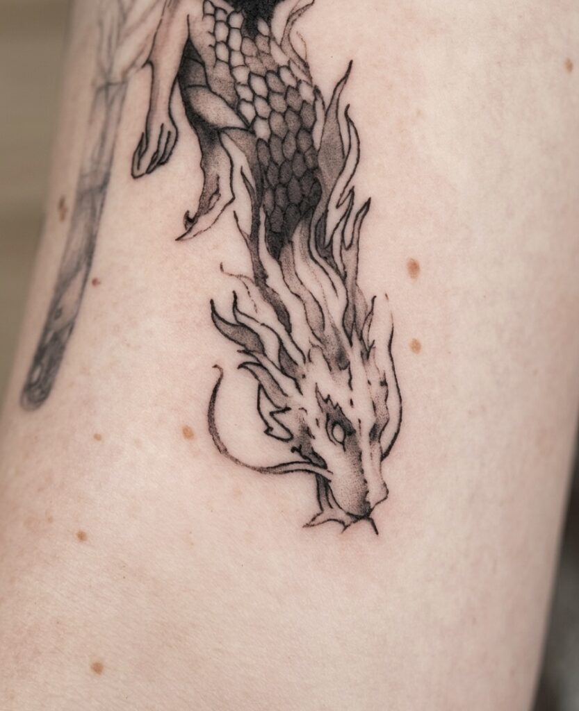 Tatouage dragon créa 2026 plus détails lignes fines face black work.